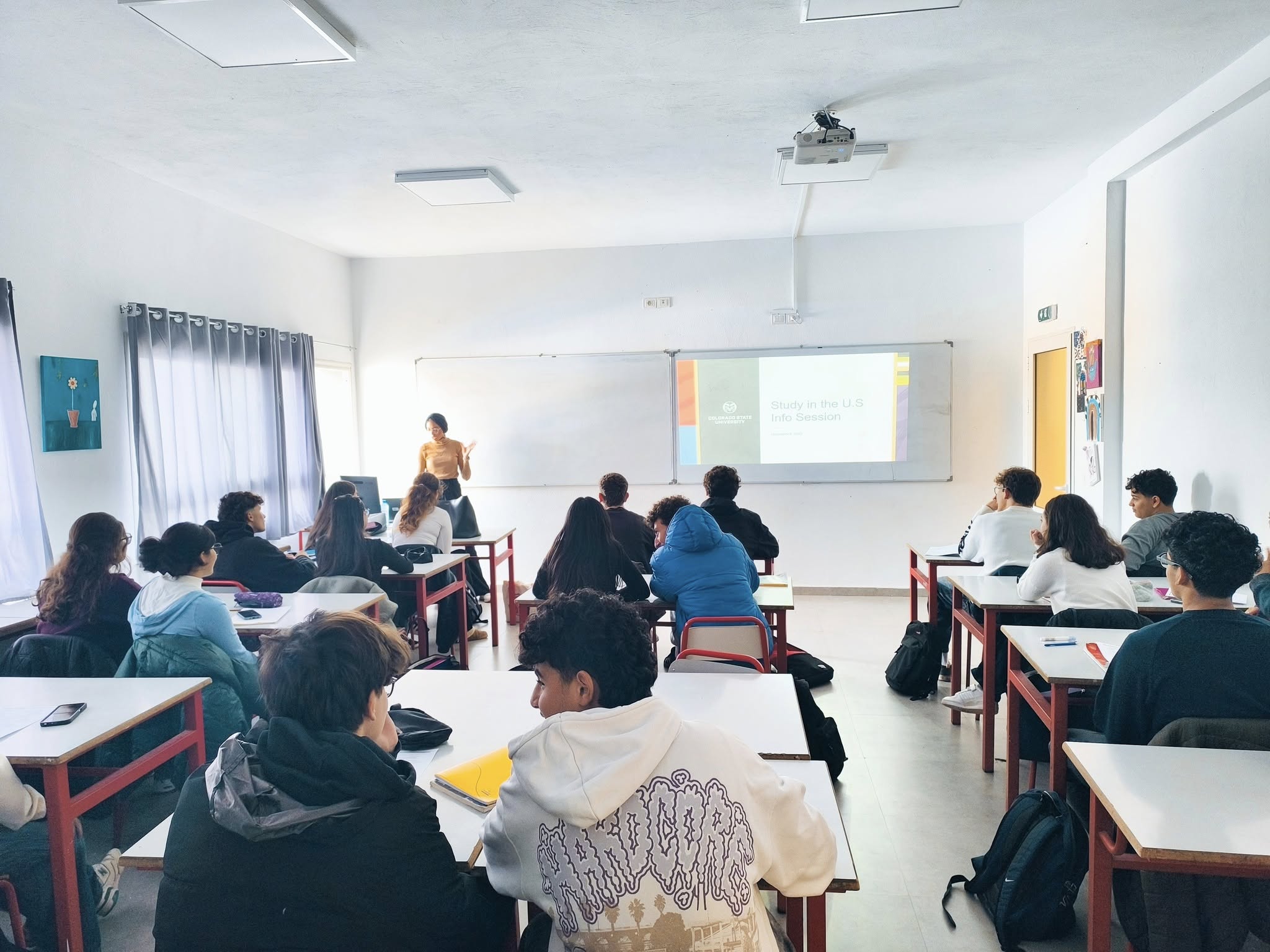 À travers leurs interventions, elles ont présenté aux élèves de Première les différentes possibilités d’études universitaires aux États-Unis, en mettant en lumière la diversité des universités, des programmes académiques et des parcours proposés. Elles ont également expliqué de manière détaillée les étapes clés des démarches d’admission, les conditions d’inscription, les tests requis, ainsi que les aspects liés aux bourses, au financement et à la vie étudiante.