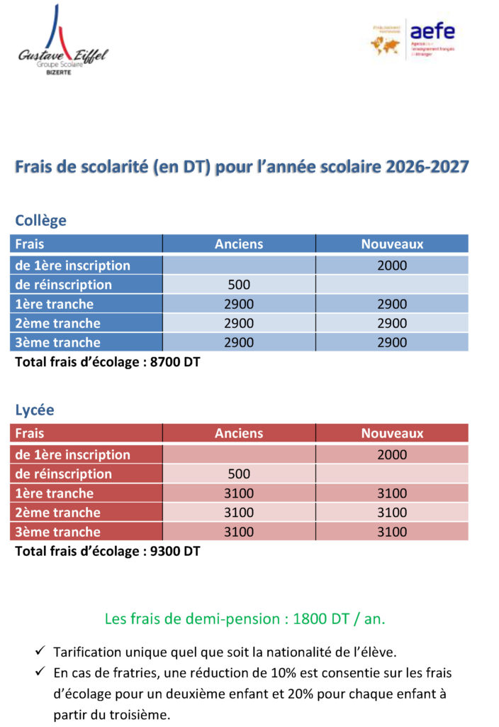 Frais de scolarité 2026/2027