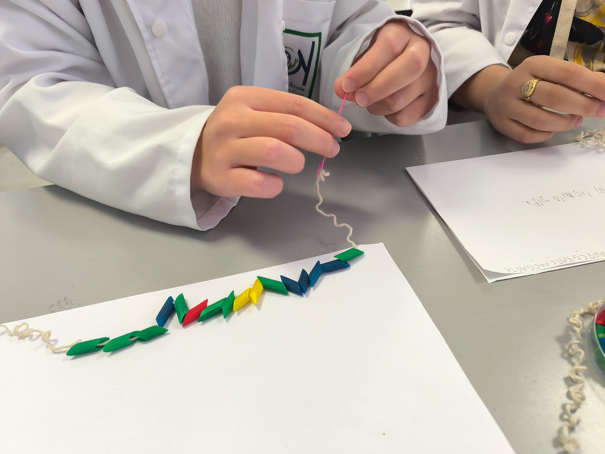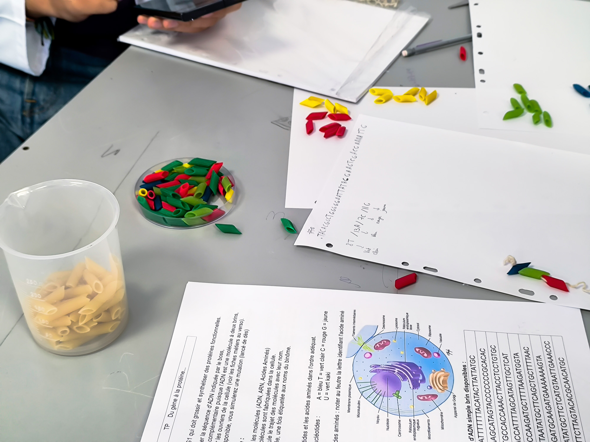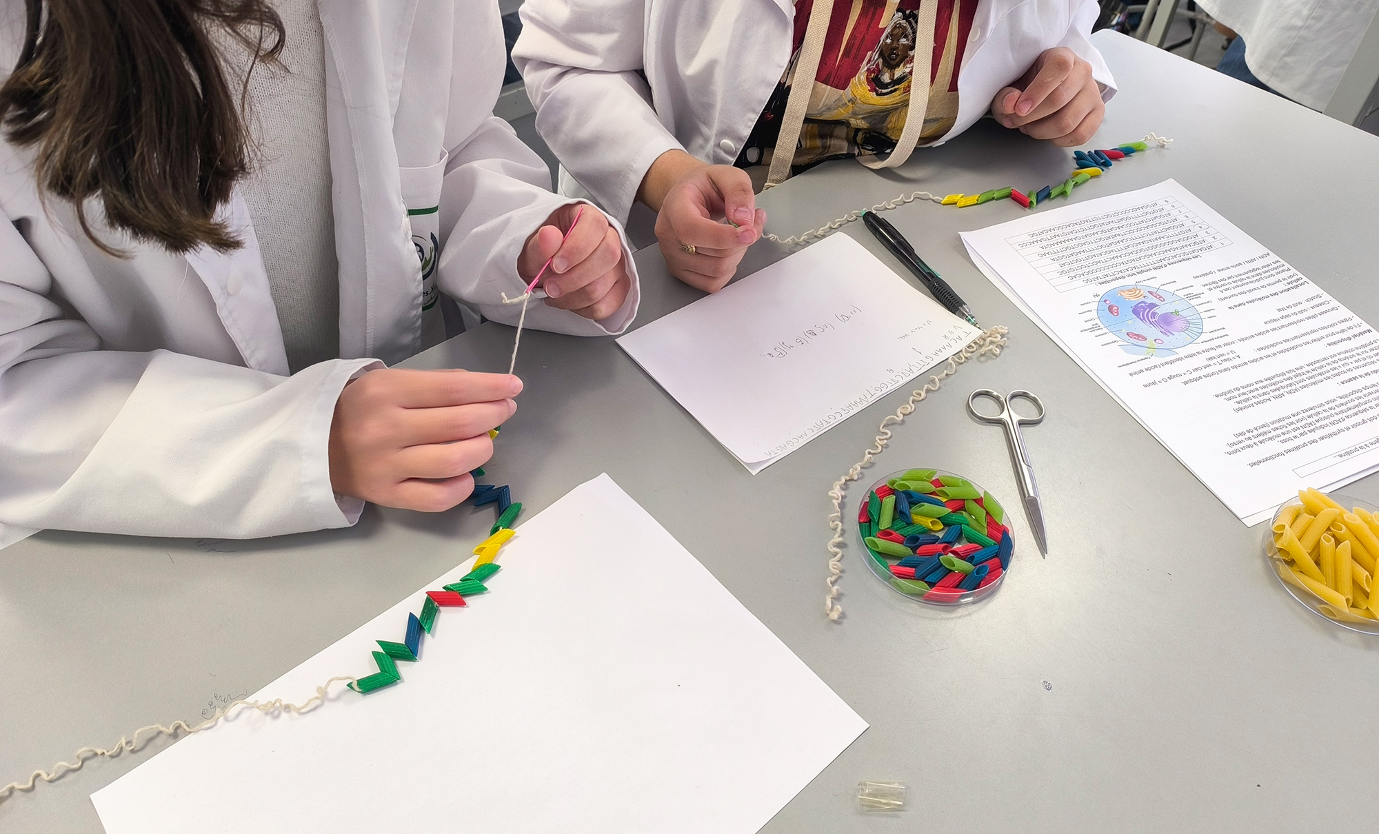 Armés de fils de laine et de pâtes colorées — bleues, vertes, rouges, jaunes pour symboliser les nucléotides — ils ont d’abord construit le brin complémentaire d’une séquence d’ADN.